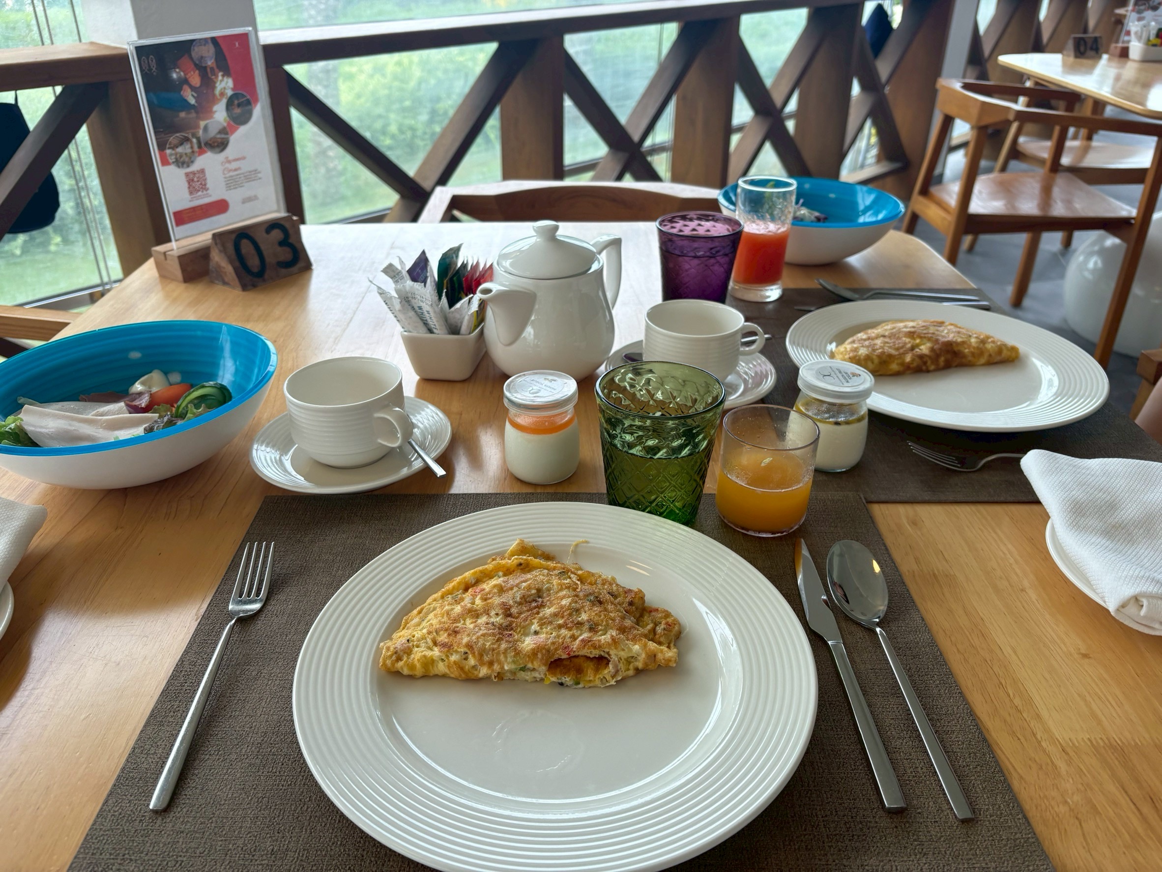 - 朝食です。出来たてのオムレツおいしかったです。